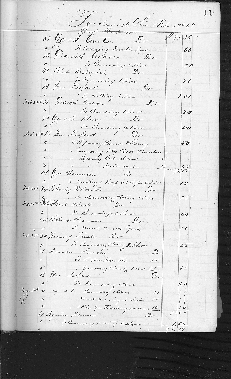 Frederick Ohio Ledger Book Index Pages 3 to 12Francis Beck Mar 2 1869, page 12George Beck Mar 2 1869, page 12 Henry Belston Feb 15 1869, page 10 D W Bowman Jan 12 1869, page 4 D W Bowman Feb 9 1869, page 9 D W Bowman Mar 2 1869, page 12 J Bowman Jan 28 1869, page 7 J Bowman Jan 28 1869, page 7 Jos Bowman Feb 23 1869, page 11 Jos Bowman Mar 3 1869, page 12 John Cassle Feb 4 1869, page 8 John Cassle Feb 9 1869, page 9 Cassle & Moat Feb 10 1869, page 9 Cassle & Moat Feb 13 1869, page 10 Jacob H Cincle? Feb 10 1869, page 9 David Craven Jan 11 1869, page 3 David Craven Jan 21 1869, page 5 David Craven Jan 25 1869, page 6 David Craven Feb 4 1869, page 8 David Craven Feb 13 1869, page 10 David Craven Feb 13 1869, page 10 David Craven Feb 19 1869, page 11 David Craven Feb 22 1869, page 11 Jacob Cress Jan 21 1869, page 5 Jacob Criss Feb 10 1869, page 9 Jacob Curtis Feb 19 1869, page 11 Noah Curtis Mar 2 1869, page 12 Geo Elliot Jan 25 1869, page 6 William Elliott Mar 1 1869, page 12 Wm Elliott Feb 4 1869, page 8 A Fenner Jan 12 1869, page 4 A Fenner Feb 8 1869, page 8 A. Fenner Jan 11 1869, page 3 A. Fenner Jan 12 1869, page 4 A. Fenner Jan 25 1869, page 6 Agustus Fenner Mar 1 1869, page 11 John Fenner Jan 11 1869, page 3 John Fenner Jan 12 1869, page 4 John Fenner Jan 25 1869, page 6 John Fenner Jan 25 1869, page 6 Lyda Fenner Jan 21 1869, page 5 Samuel Fenner Jan 25 1869, page 6 Henry Fissle Jan 25 1869, page 6 Henry Fissle Feb 9 1869, page 9 Henry Fissle Feb 27 1869, page 11 Henry Fissler Jan 12 1869, page 4 Henry Fissler Feb 10 1869, page 9 John G Fritz Jan 12 1869, page 4 A Furnas Feb 18 1869, page 10 Aaron Furnas Jan 11 1869, page 3 Aaron Furnas Jan 21 1869, page 5 Aaron Furnas Jan 28 1869, page 7 Aaron Furnas Feb 27 1869, page 11 Aaron Furnas Mar 2 1869, page 12 Aaron Furnas Jan 12 1869, page 4 Davis Furnas Jan 12 1869, page 4 Davis Furnas Jan 28 1869, page 7 Davis Furnas Feb 8 1869, page 9 Davis Furnas Feb 9 1869, page 9 Davis Furnas Feb 10 1869, page 9 Davis Furnas Feb 15 1869, page 10 Davis Furnas Mar 2 1869, page 12 Lida Furnas Feb 4 1869, page 8 Robert Furnas Feb 4 1869, page 8 Sam Furnas Jan 28 1869, page 7 Samuel Furnas Jan 11 1869, page 3 Samuel Furnas Jan 12 1869, page 4 Samuel Furnas Feb 13 1869, page 10 Samuel Furnas Feb 15 1869, page 10 Samuel Furnas Feb 15 1869, page 10 Samuel Furnas Mar 3 1869, page 12 Alex Helenick Jan 25 1869, page 6 Alex Helmick Feb 19 1869, page 11 John Hendrickson Feb 13 1869, page 10 Albert Kindle Feb 25 1869, page 11 Francis Krick Feb 4 1869, page 8 Frank Krick Jan 25 1869, page 6 John Leckman Mar 2 1869, page 12 John Leckrone Mar 3 1869, page 12 John Lecksone Jan 28 1869, page 7 John Lecksone Feb 4 1869, page 8 Geo Leopard Jan 11 1869, page 3 Geo Leopard Jan 25 1869, page 6 Geo Leopard Jan 28 1869, page 7 Geo Leopard Feb 19 1869, page 11 Geo Leopard Feb 23 1869, page 11 Geo Leopard Feb 27 1869, page 11 Geo Leopard Mar 1 1869, page 11 George Leopard Jan 21 1869, page 5 Eli Link/Sink Jan 11 1869, page 3 Eli Links/Sinks Jan 11 1869, page 3 Henry Lissle Jan 28 1869, page 7 Enoch Macy Jan 11 1869, page 3 Enoch Macy Jan 11 1869, page 3 Enoch Macy Jan 21 1869, page 5 Moses Macy Jan 28 1869, page 7 Thomas Macy Jan 11 1869, page 3 Thomas Macy Mar 1 1869, page 12 Thomas J Macy Jan 11 1869, page 3 Thomas J Macy Jan 12 1869, page 4 Thomas Macy Sr Jan 11 1869, page 3 Thomas Macy Sr Jan 12 1869, page 4 James Mahaffey Feb 17 1869, page 10 James Mahaffey Mar 2 1869, page 12 S P & D Miller Jan 12 1869, page 4 S P & D Miller Jan 25 1869, page 6 S P & D Miller Jan 21 1869, page 5 William A Moat Feb 13 1869, page 10 Henry Neal Feb 15 1869, page 10 Robert Pearson Jan 11 1869, page 3 Robert Pearson Feb 4 1869, page 8 Robert Pearson Feb 4 1869, page 8 Robert Pearson Feb 25 1869, page 11 Levi Prill Jan 12 1869, page 4 Levi Prill Feb 4 1869, page 8 Sam Reed Jan 11 1869, page 3 Sam Reed Jan 12 1869, page 4 Sam Reed Jan 12 1869, page 4 Sam Reed Jan 21 1869, page 5 Sam Reed Jan 25 1869, page 6 Sam Reed Jan 25 1869, page 6 Sam Reed Jan 28 1869, page 7 Samuel Reed Jan 11 1869, page 3 Samuel Reed Jan 21 1869, page 5 Samuel Reed Jan 28 1869, page 7 Samuel Reed Feb 4 1869, page 8 Samuel Reed Feb 8 1869, page 9 Samuel Reed Feb 9 1869, page 9 Samuel Reed Feb 11 1869, page 9 Samuel Reed Feb 15 1869, page 10 Samuel Reed Mar 1 1869, page 12 Samuel Reed Mar 2 1869, page 12 John Right Jan 21 1869, page 5 John Right Jan 25 1869, page 6 Michael Roderick Feb 4 1869, page 8 Michael Roderick Feb 17 1869, page 10 Michael Roderick Mar 1 1869, page 12 Eli Sinks Jan 21 1869, page 5 Eli Sinks Jan 28 1869, page 7 Eli Sinks Feb 4 1869, page 8 Samuel Snell Feb 4 1869, page 8 Samuel Snell Feb 18 1869, page 10 John Sticklager Jan 25 1869, page 6 John Stocklager Jan 12 1869, page 4 John Stocklager Jan 21 1869, page 5 John Stocklager Jan 28 1869, page 7 John Stocklager Feb 4 1869, page 8 John Stocklager Feb 9 1869, page 9 John Stocklager Feb 11 1869, page 10 John Stocklager Feb 11 1869, page 10 John Stocklager Mar 1 1869, page 12 John H? Stocklager Jan 28 1869, page 7 John Stoglager Jan 11 1869, page 3 John Stoglager Jan 21 1869, page 5 Jacob Stoner Jan 28 1869, page 7 Jacob Stoner Feb 11 1869, page 9 Jacob Stoner Feb 22 1869, page 11 Alex? Vore (Von?) Jan 28 1869, page 7 Thomas Werts Jan 11 1869, page 3 Thomas Werts Jan 21 1869, page 5 Charley Wolverton Jan 21 1869, page 5 Charly Wolverton Feb 24 1869, page 11 Eli Yount Jan 28 1869, page 7 Fred Yount Jan 25 1869, page 6 Frederick Yount Jan 25 1869, page 6 Eli Yourt Jan 12 1869, page 4 View the Frederick, Miami County Ohio, Blacksmith ledger book Page 3. View the Frederick, Miami County Ohio, Blacksmith ledger book Page 4. View the Frederick, Miami County Ohio, Blacksmith ledger book Page 5. View the Frederick, Miami County Ohio, Blacksmith ledger book Page 6. View the Frederick, Miami County Ohio, Blacksmith ledger book Page 7. View the Frederick, Miami County Ohio, Blacksmith ledger book Page 8. View the Frederick, Miami County Ohio, Blacksmith ledger boo