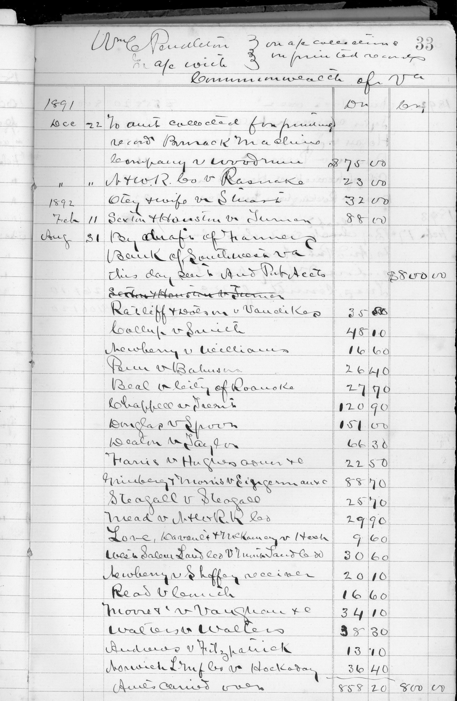 | | Wytheville, Wythe County, Virginia Court Records Ledger This old Court ledger book belonged to William C Pendleton. William C. Pendleton was born in Marion, Virginia, in 1847 and served in the 8th Virginia Cavalry in Tazewell County. After the Civil War he studied law and practiced in Richmond, Virginia. He was the author of the History of Tazewell County and Southwest Virginia 1748-1920